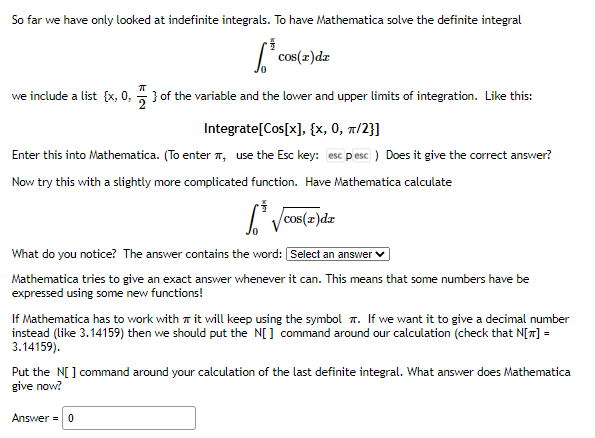 Mathematica Integral Calculator. The integral calculator supports definite and indefinite integrals (antiderivatives) as well as integrating functions with many. If the calculator did not compute something or you have identified an error, or you have a suggestion/feedback, please write it in the comments below.